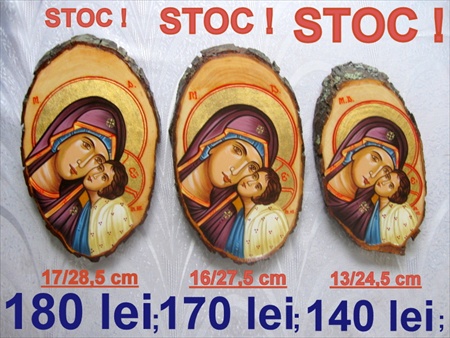 - Icoană STOC 4. - Icoană Maica Domnului cu Pruncul - pe lemn natur cu scoarţă ... Mărimea 14,5/23,5 cm = 140 lei ... REDUCERE 20 lei. Rest de plată 120 lei...